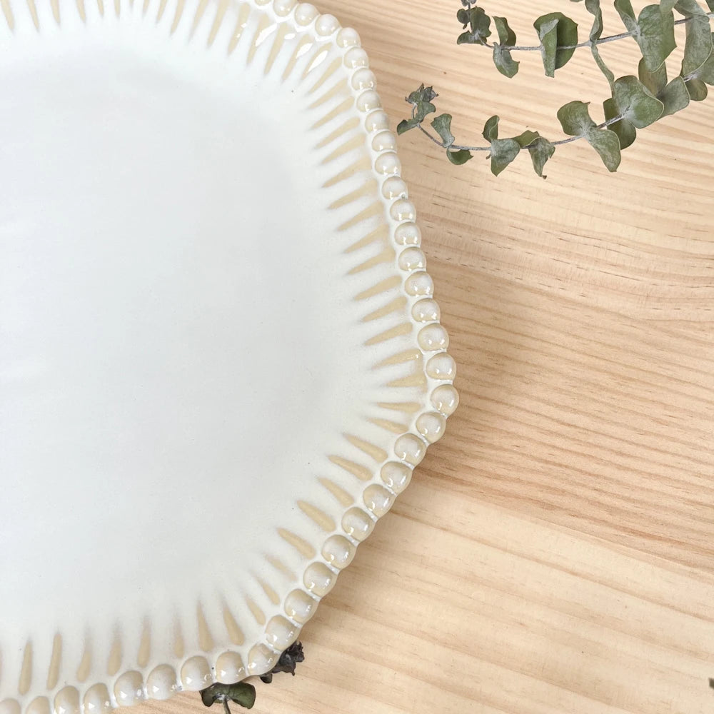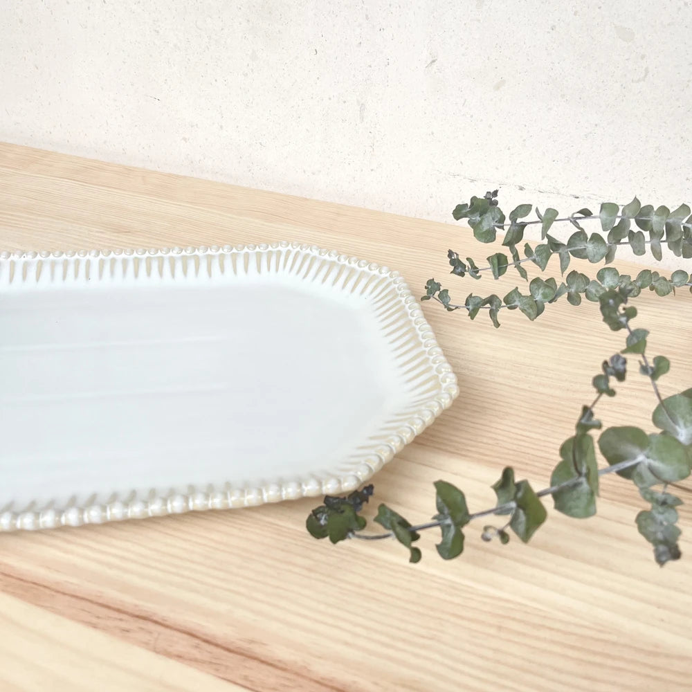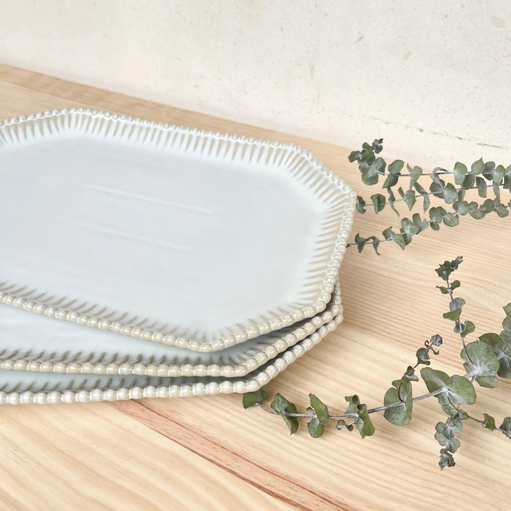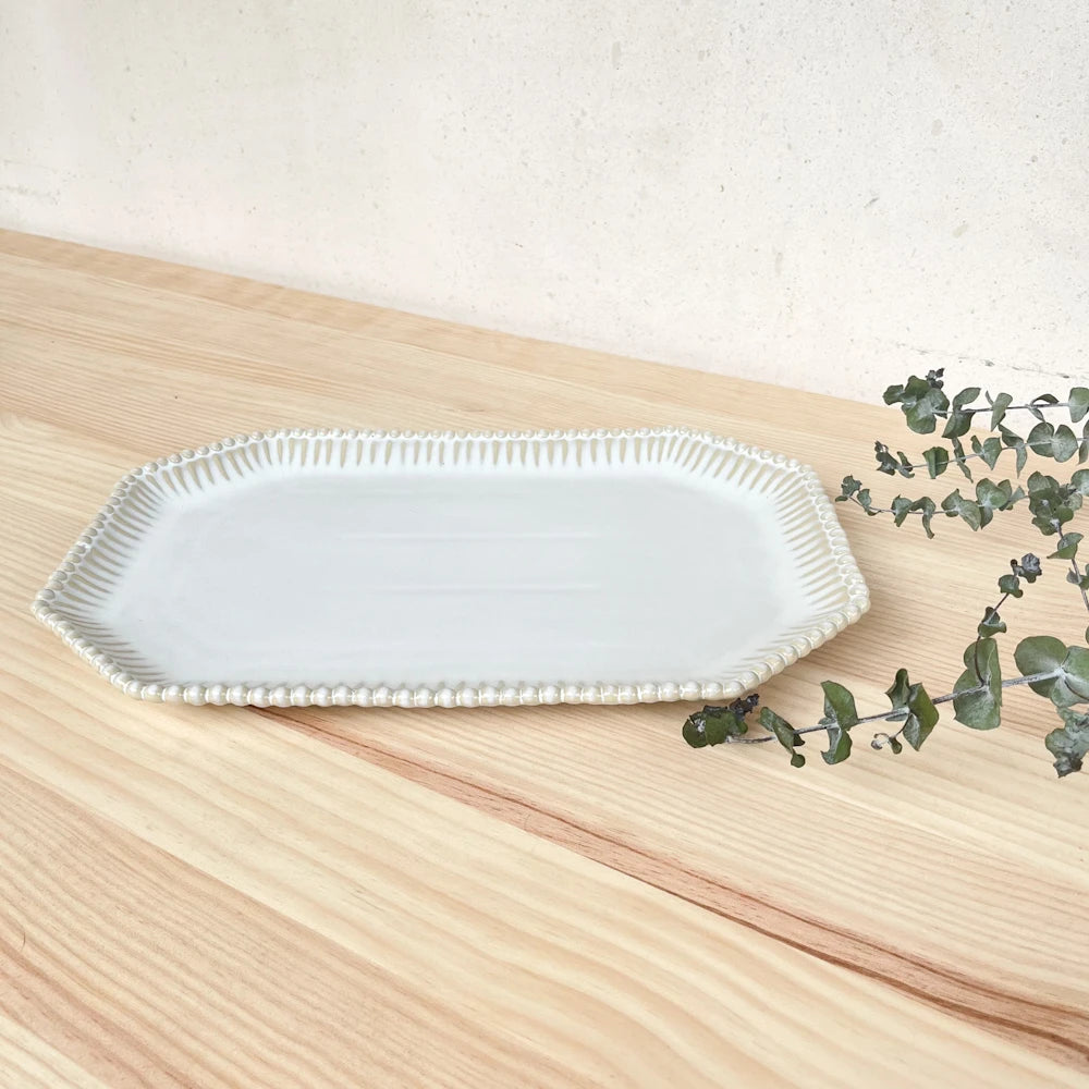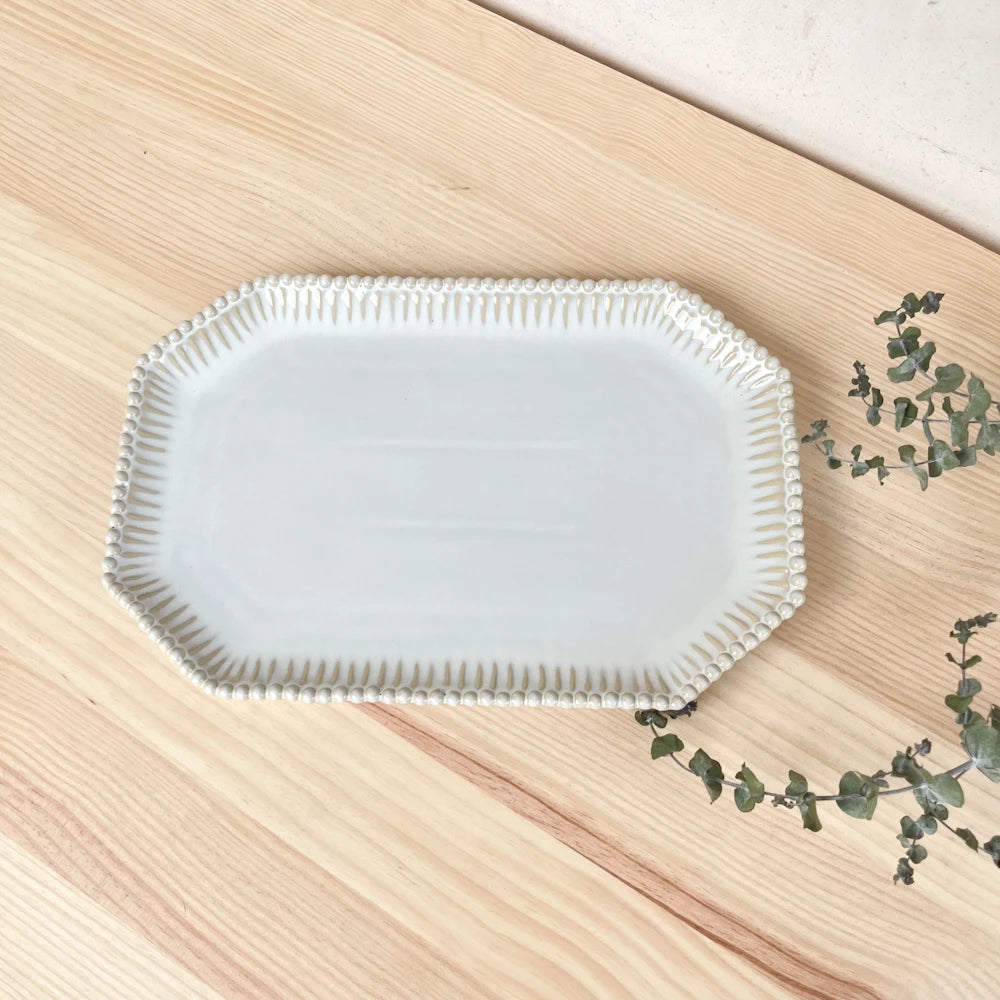 La fuente Aurora con un borde perlado le da un toque elegante y atemporal a la mesa. Con una forma octogonal y acabado en marfil lo convierte en una pieza versátil, perfecta tanto para presentar aperitivos como platos principales para grupos de personas por su tamaño.