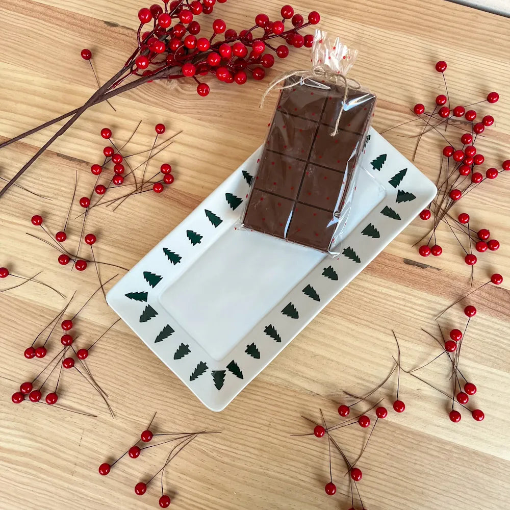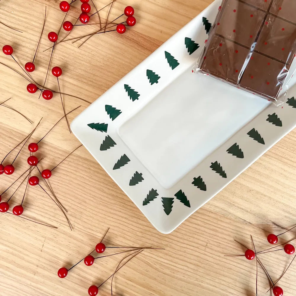 Fuente rectangular decorado en los bordes con abetos que invitan a disfrutar de la magia de la Navidad. Perfecta para servir dulces, meriendas especiales, desayunos o aperitivos.