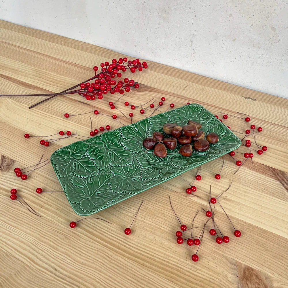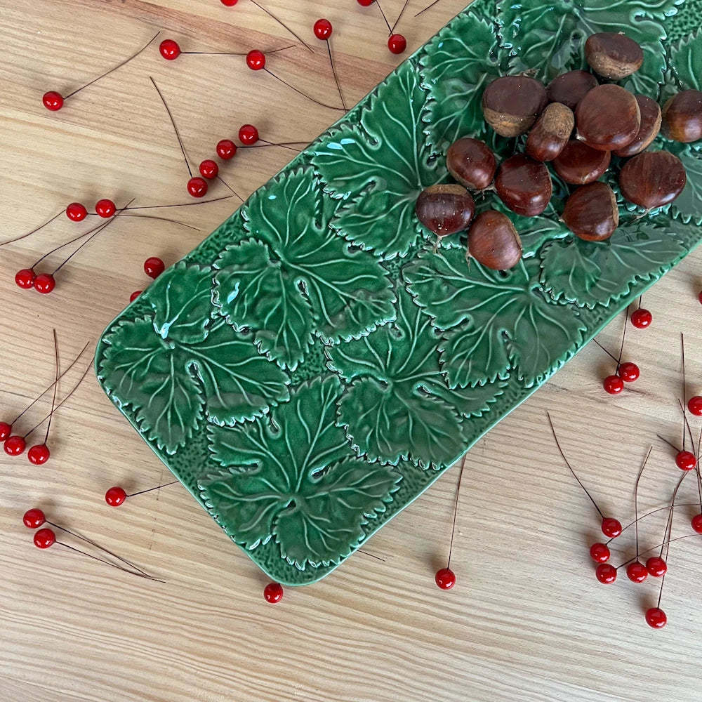 Nuestra fuente rectangular de hojas combina textura, color y carácter, convirtiéndose en el centro perfecto para un desayuno, una merienda o en el centro perfecto para servir unas verduras asadas, una ensalada o entrantes. Diseño con relieve y acabado artesanal aporta un toque cálido a cualquier sobremesa.